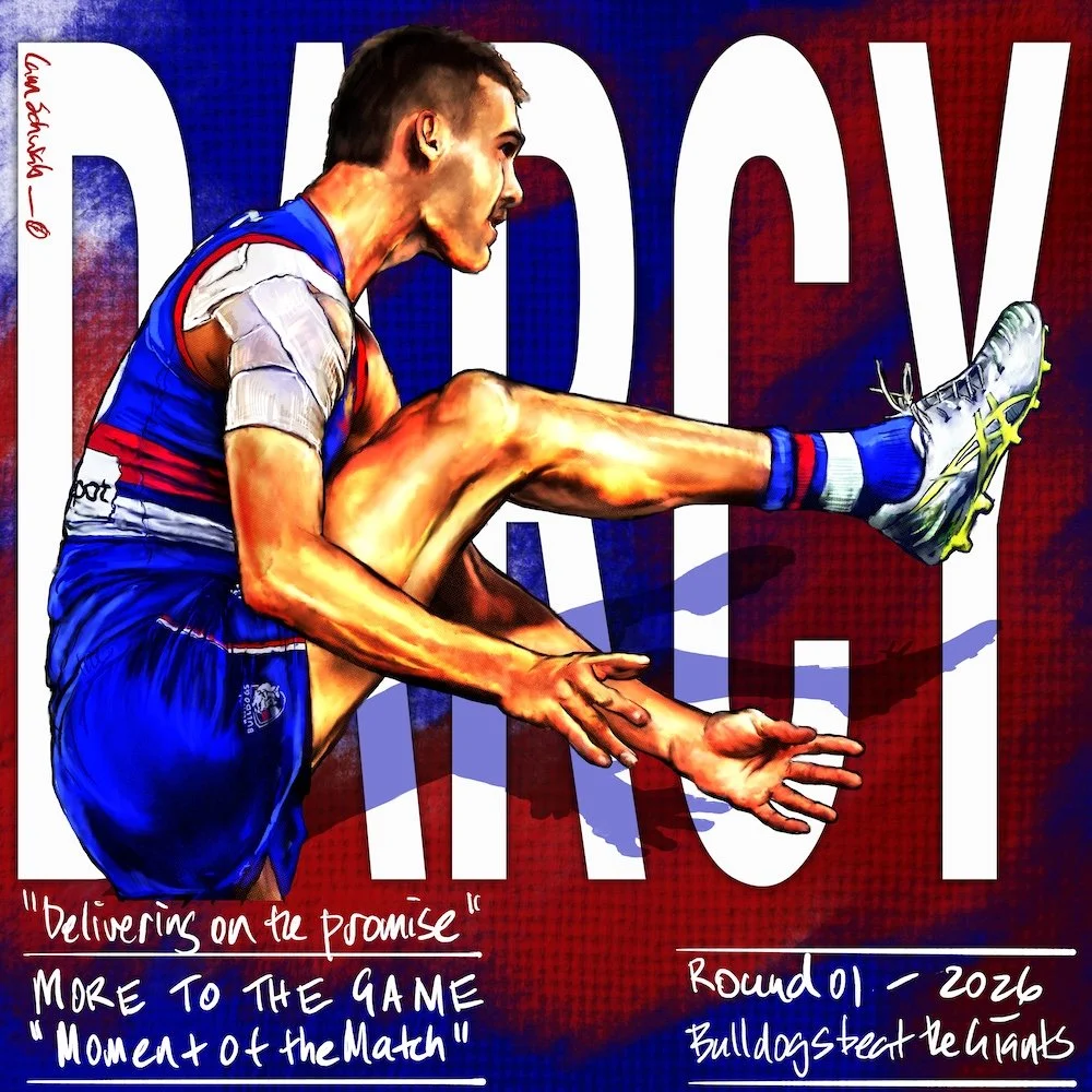 In the middle of Saturday's 81-point demolition of GWS was Sam Darcy, whom my drawing celebrates.