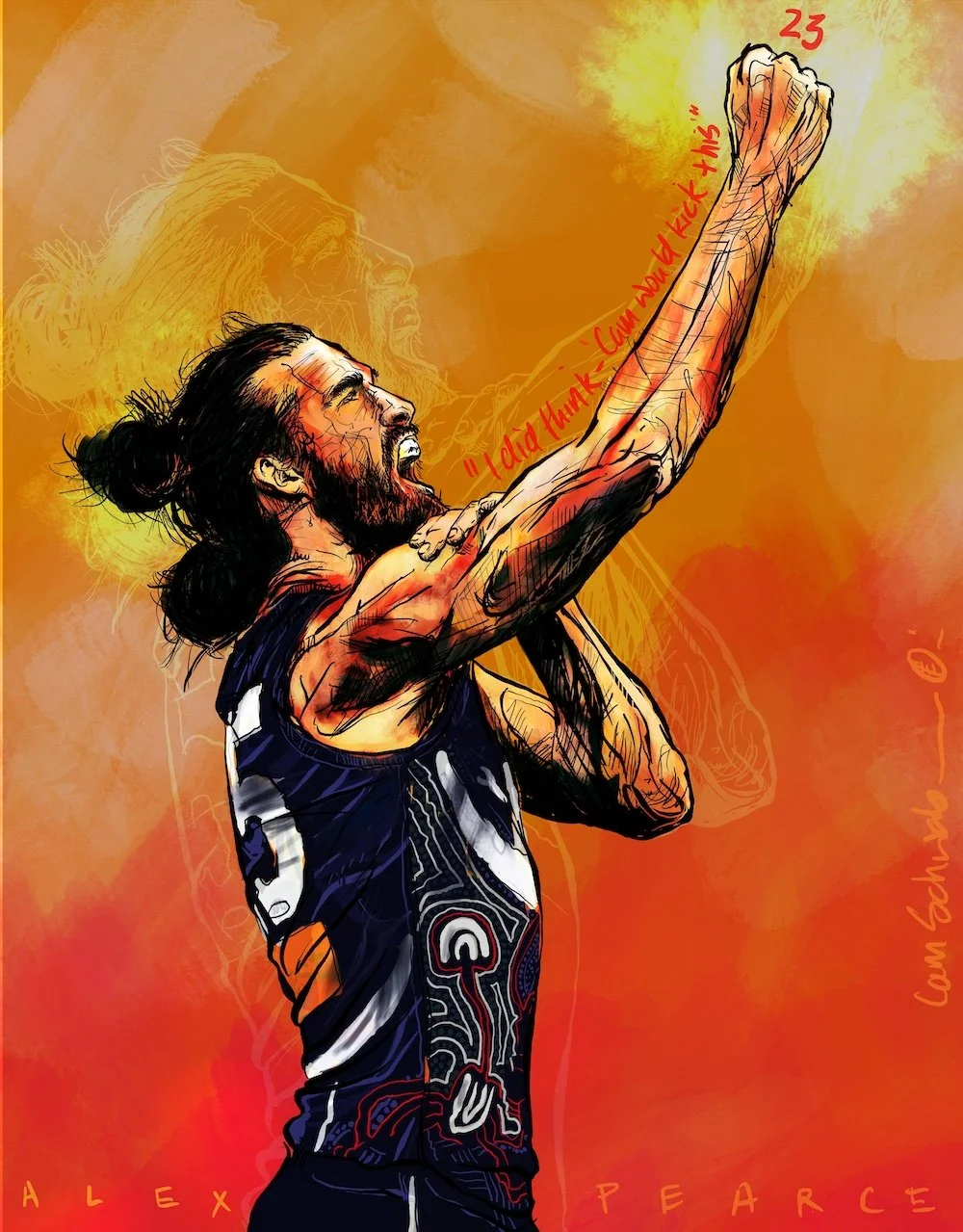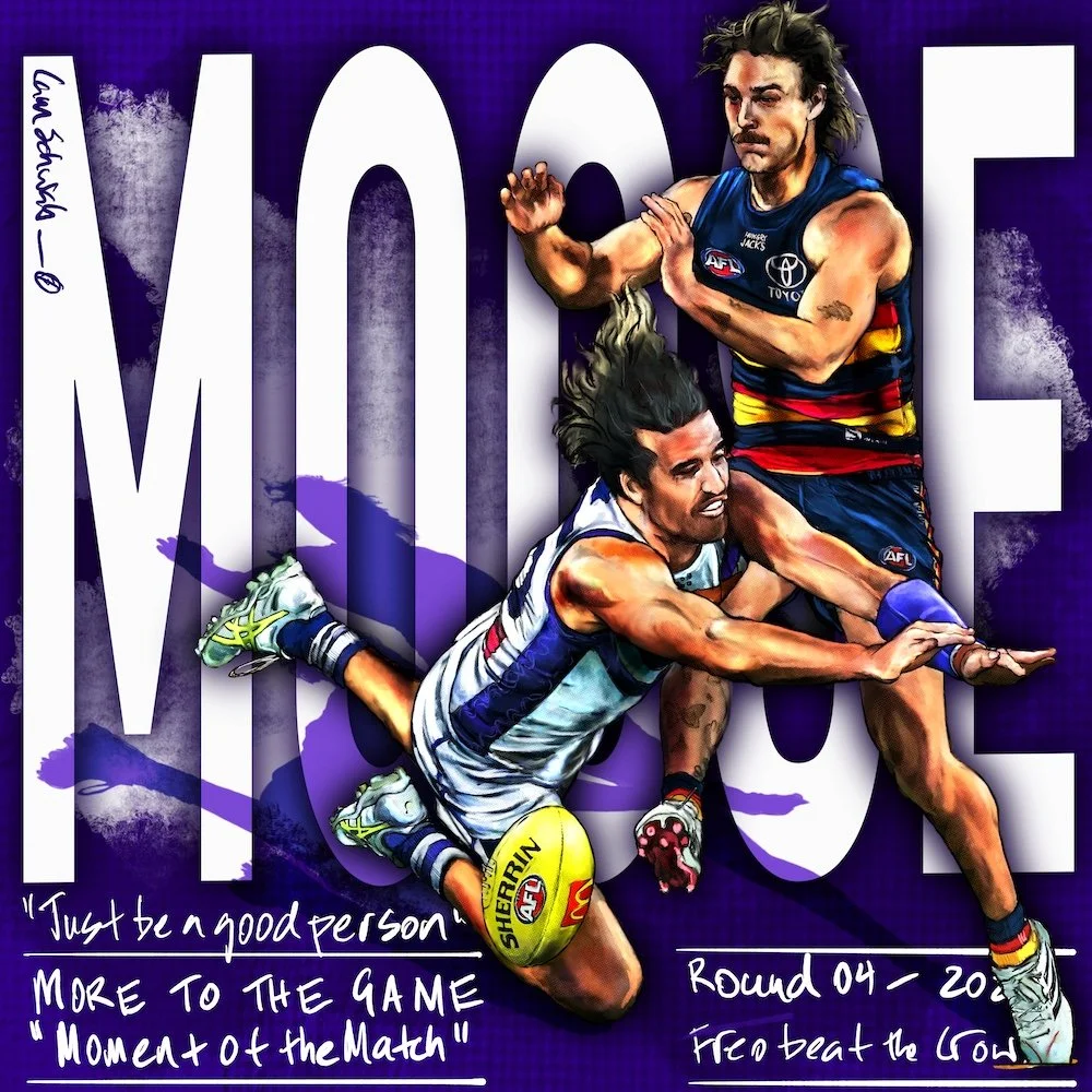 In the dying seconds, Adelaide's James Peatling shaped to kick for goal. From nowhere, Alex Pearce came diving across, sans cape but superhero in every other way, full stretch, arms out, no concern for his personal welfare, and smothered the ball, as my drawing celebrates.